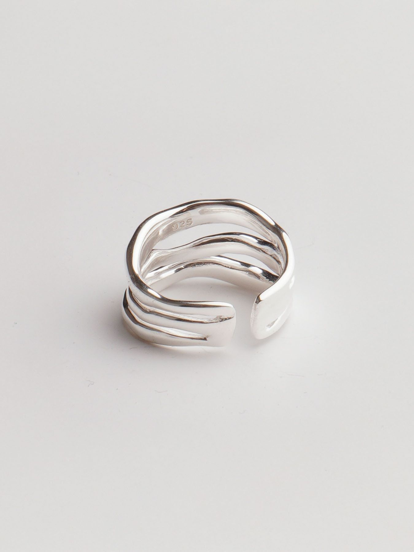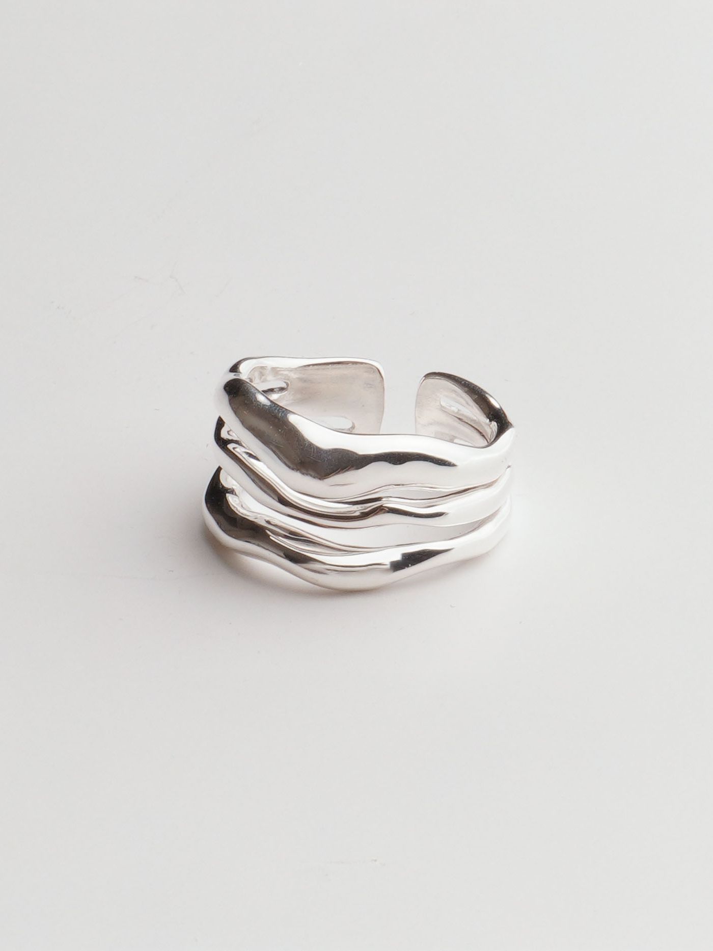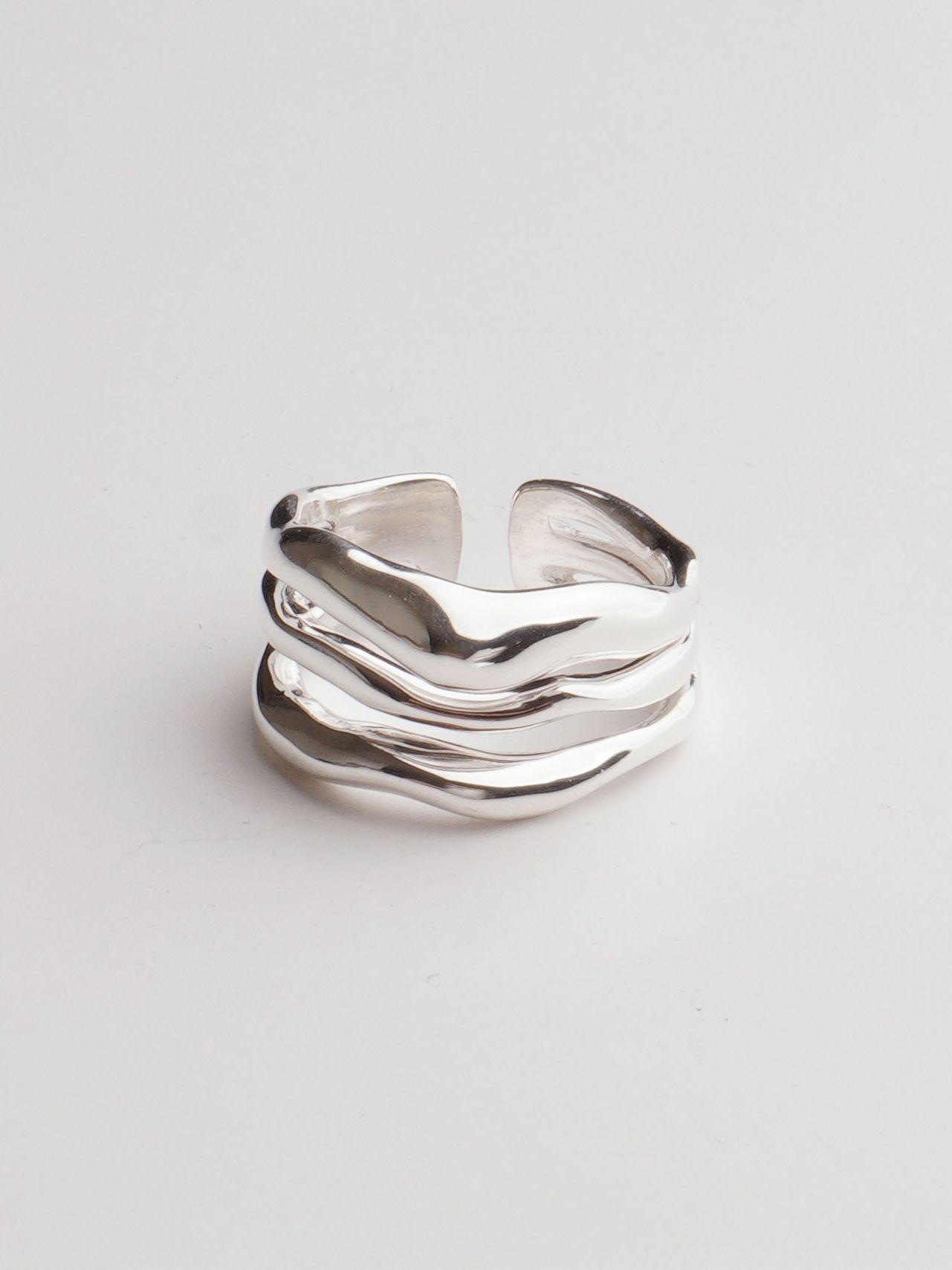 이 반지는 마치 유동적인 물결을 그대로 응고시킨 듯한 유려한 곡선이 특징입니다. 세 개의 서로 다른 곡선이 자연스럽게 겹쳐지며 유기적인 흐름을 만들어내고, 그 부드러운 실루엣은 손가락 위에서 편안하면서도 독창적인 무드를 연출합니다.