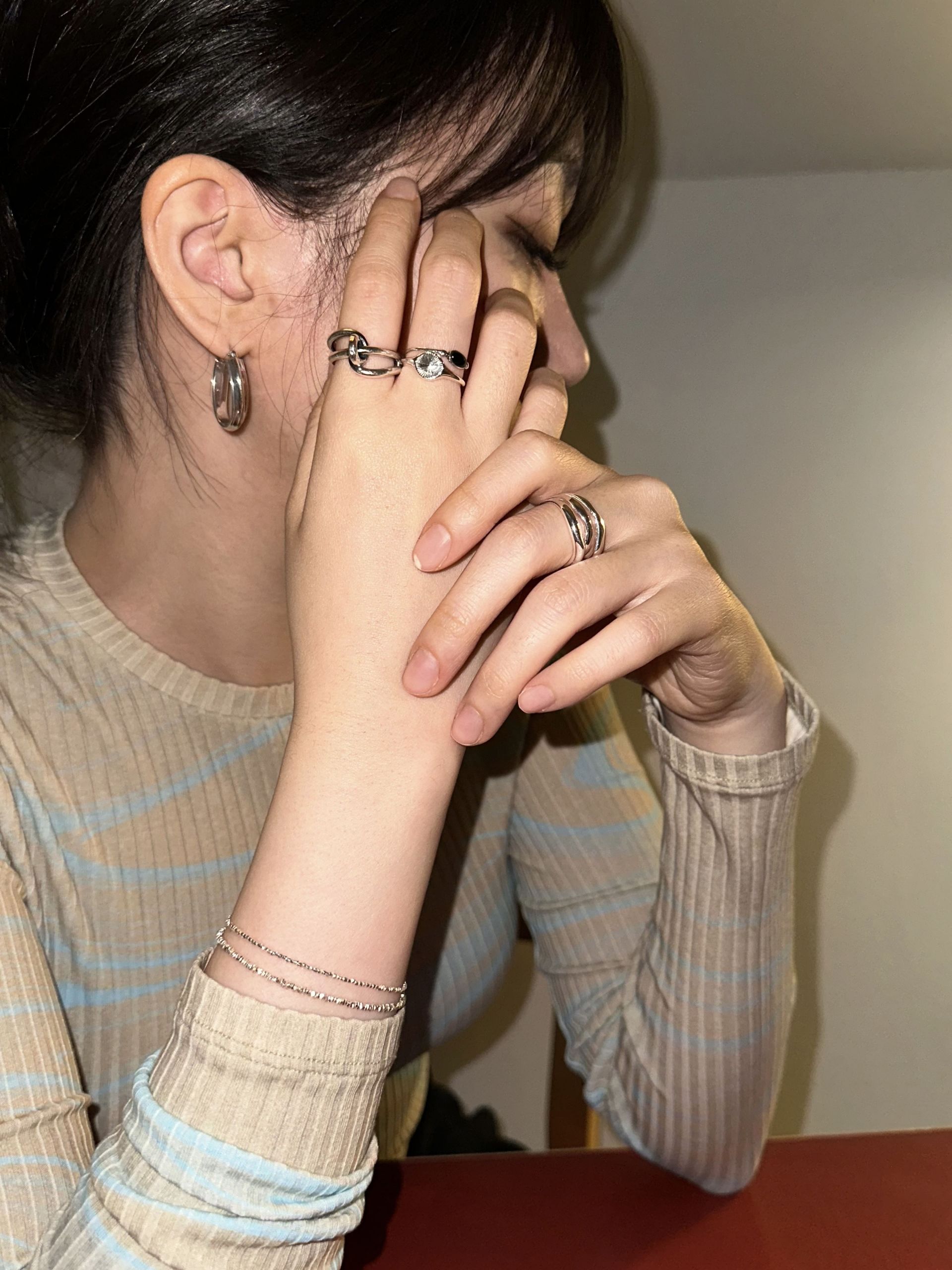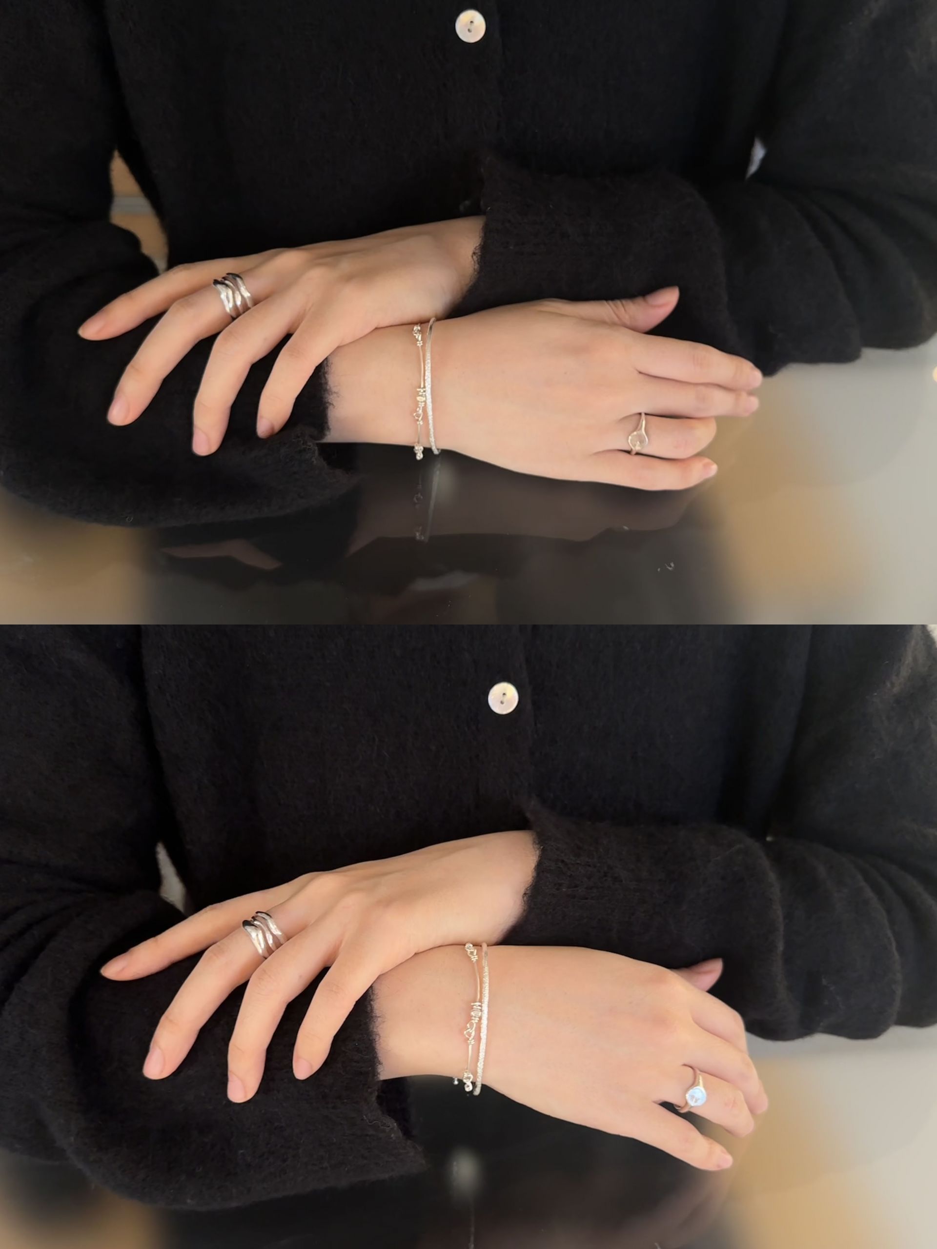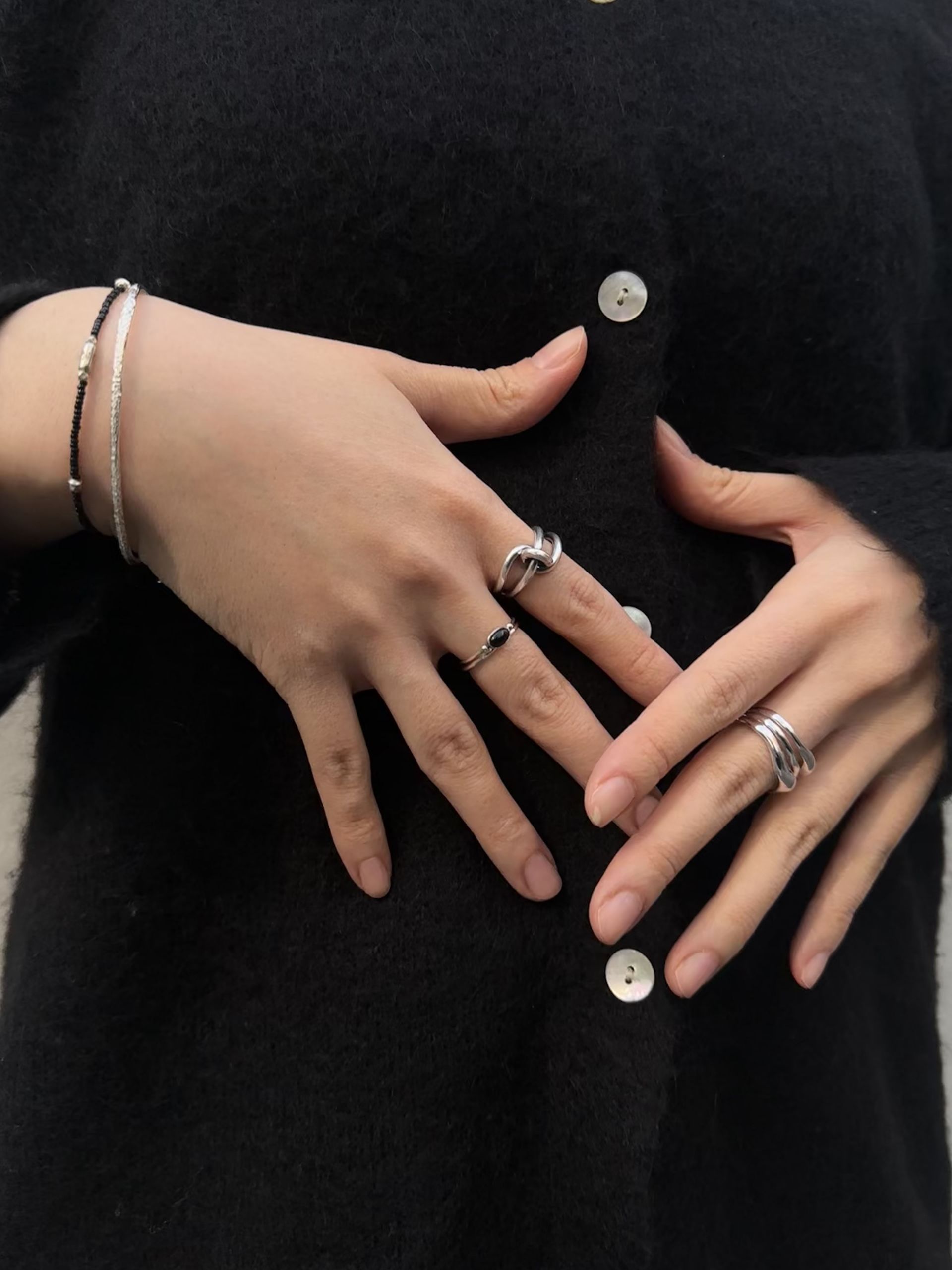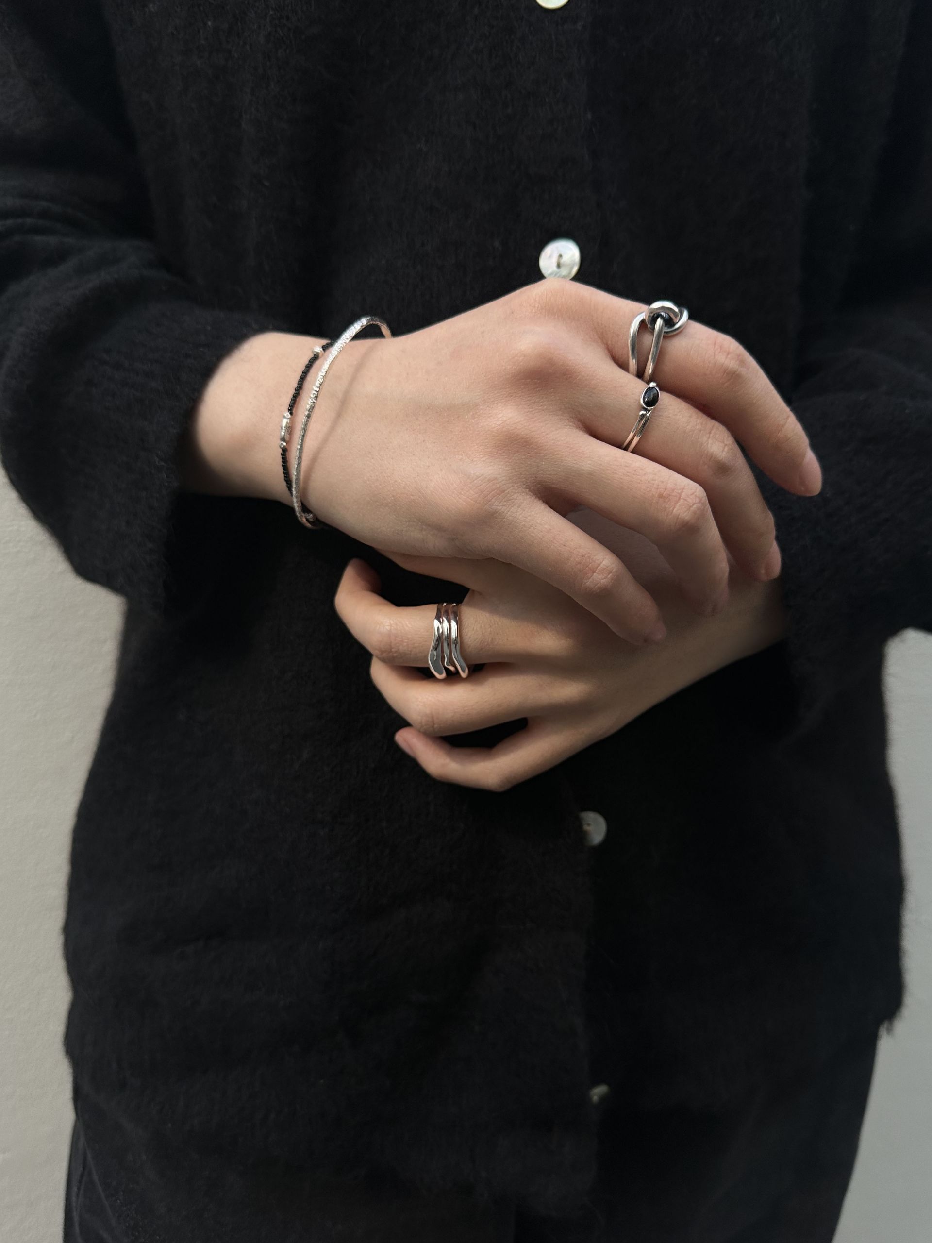이 반지는 마치 유동적인 물결을 그대로 응고시킨 듯한 유려한 곡선이 특징입니다. 세 개의 서로 다른 곡선이 자연스럽게 겹쳐지며 유기적인 흐름을 만들어내고, 그 부드러운 실루엣은 손가락 위에서 편안하면서도 독창적인 무드를 연출합니다.