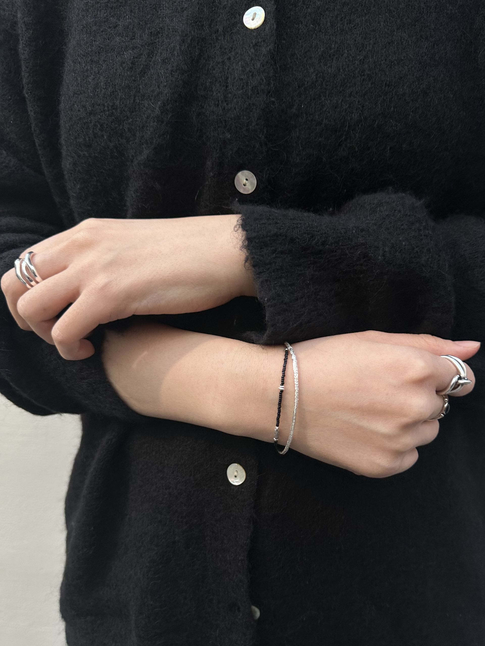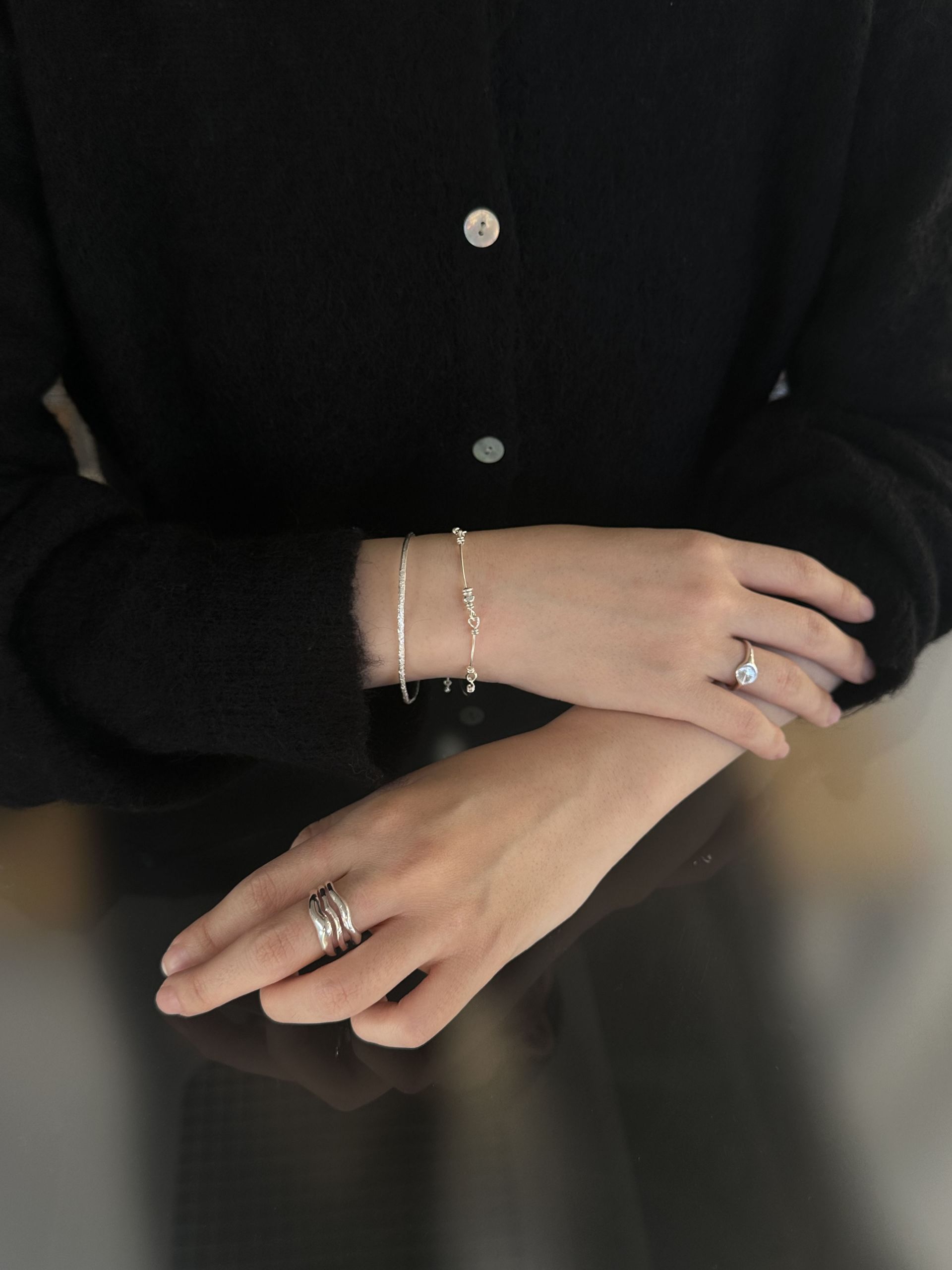 빛을 받으면 매끄럽고 윤기 있는 실버 표면이 은은하게 반사되며, 각도에 따라 미묘하게 다른 인상을 줍니다. 일정하지 않은 곡선들은 인위적인 기교 없이 자연스러운 아름다움을 강조하며, 마치 바람에 흔들리는 물결이나 부드러운 능선을 떠오르게 합니다.