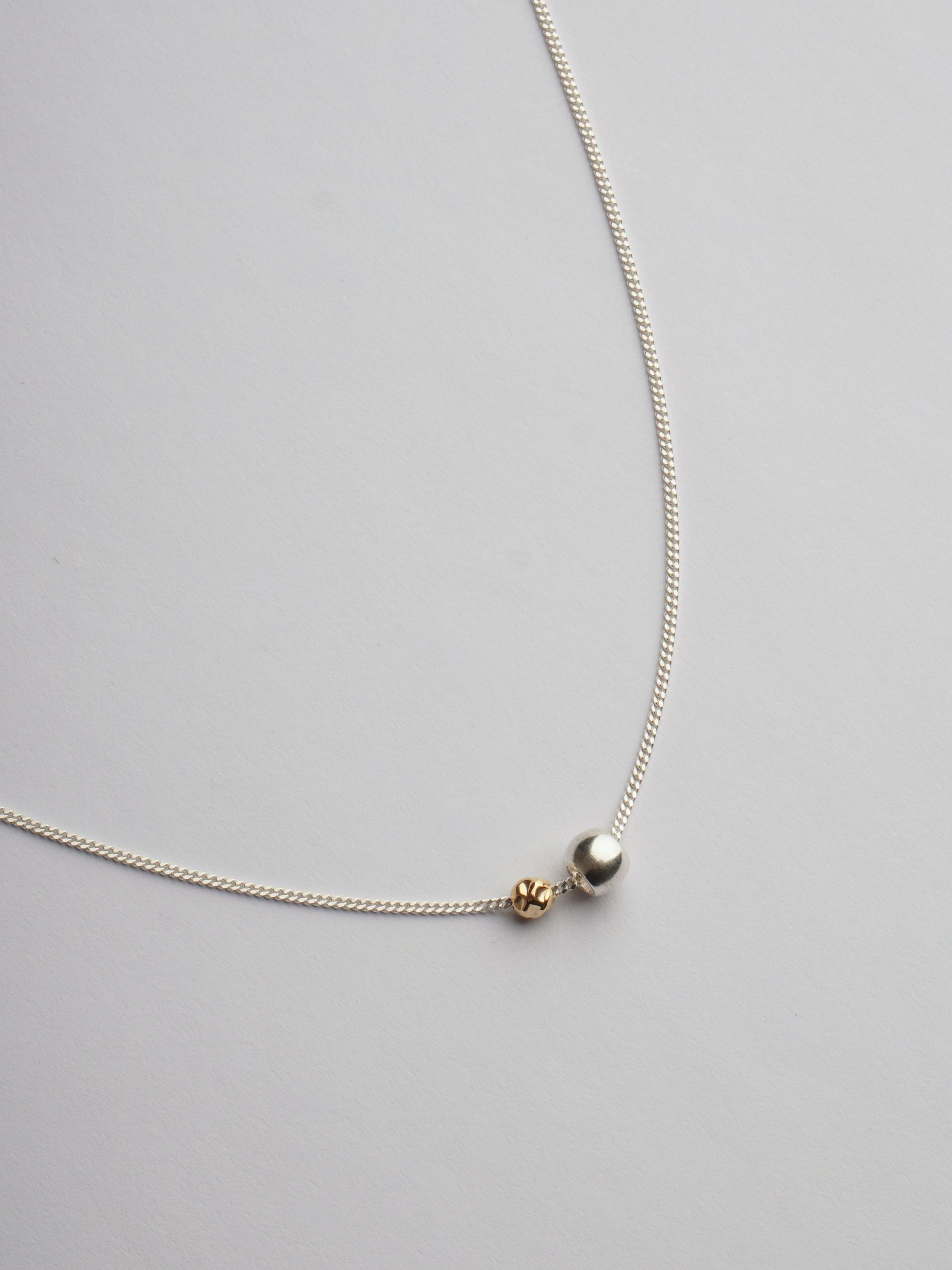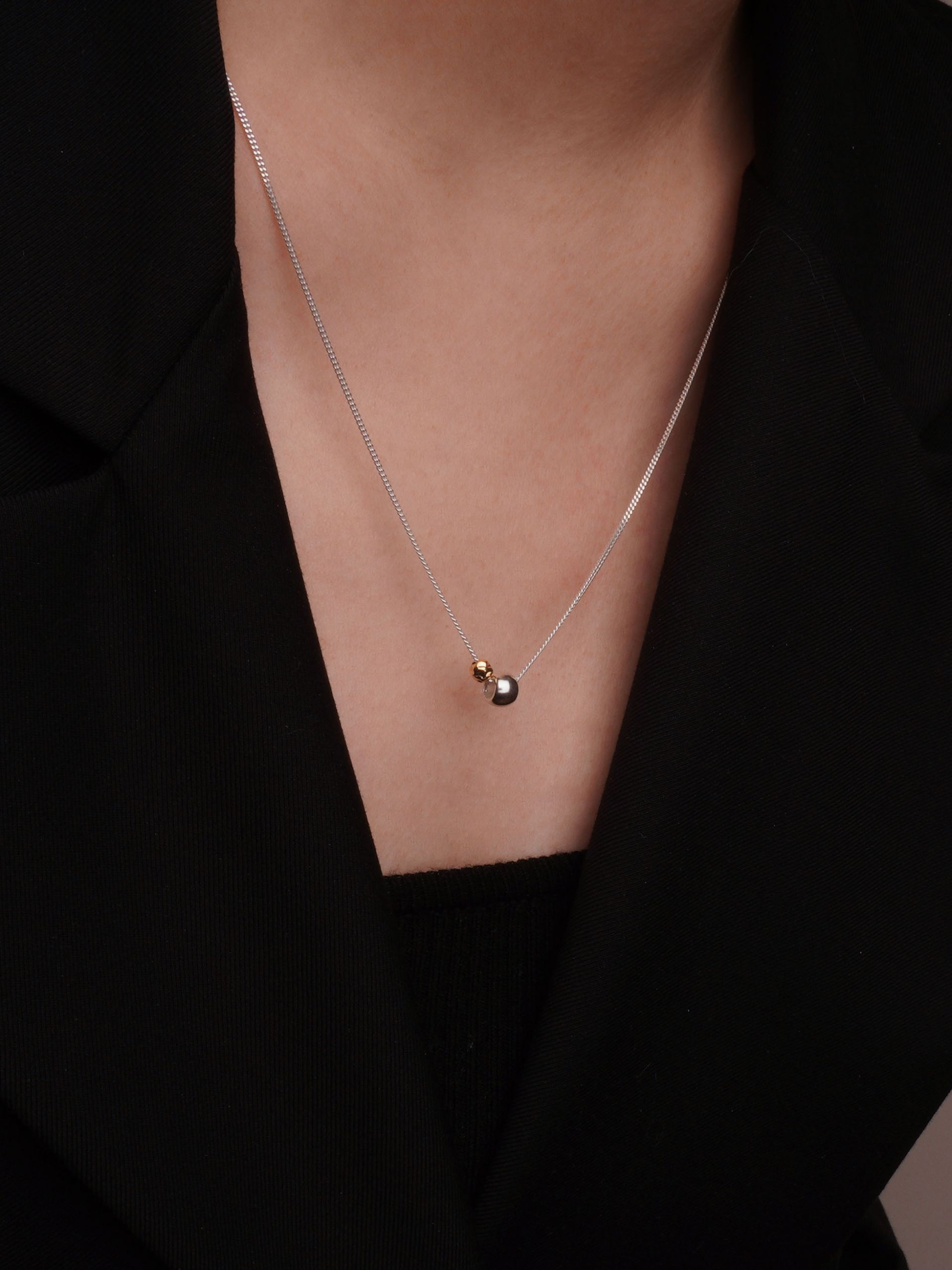 925 실버 체인에 골드와 실버 컬러의 작은 볼 장식이 자연스럽게 어우러져 모던한 무드를 완성하는 투톤 볼 체인 목걸이입니다.