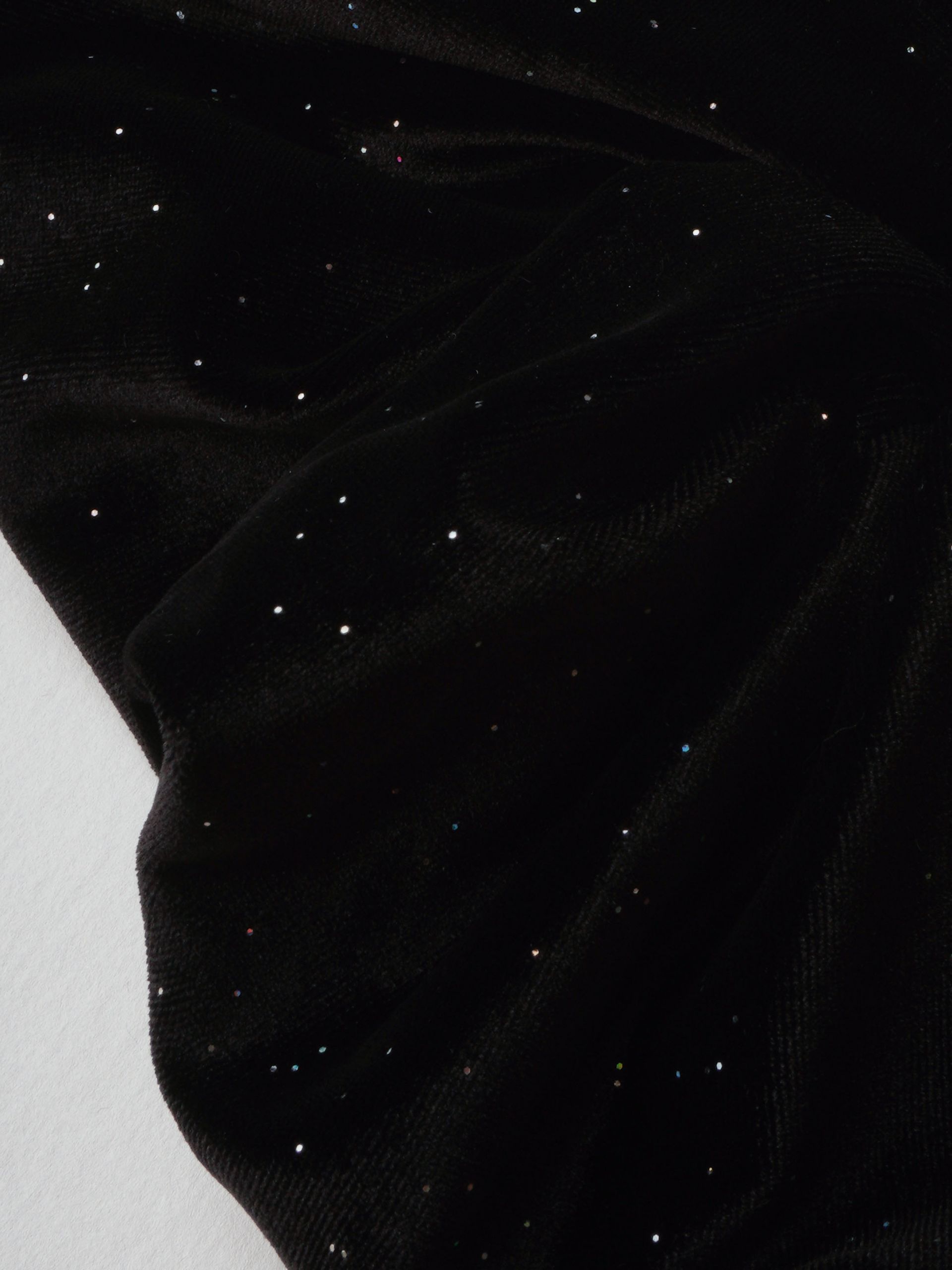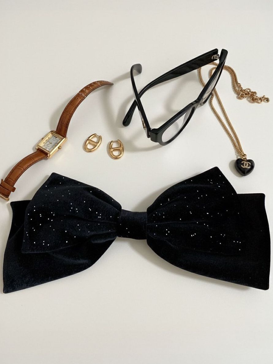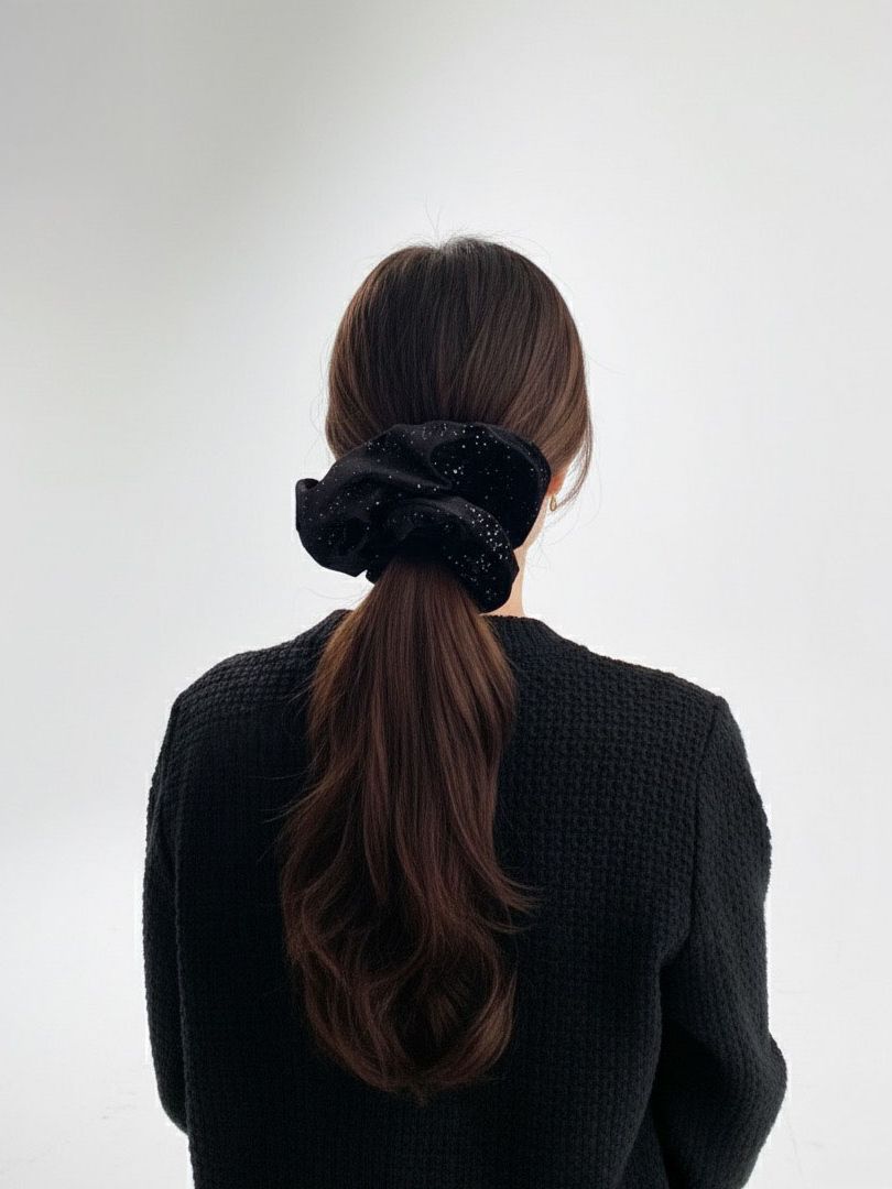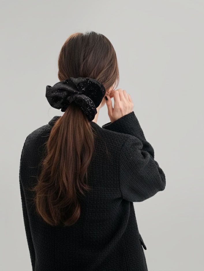 고급스러운 블랙 벨벳에 미세한 글리터가 촤르르 박혀 있어, 한눈에 봐도 밤하늘·은하수 무드가 느껴지는 스크런치와 헤어핀입니다.