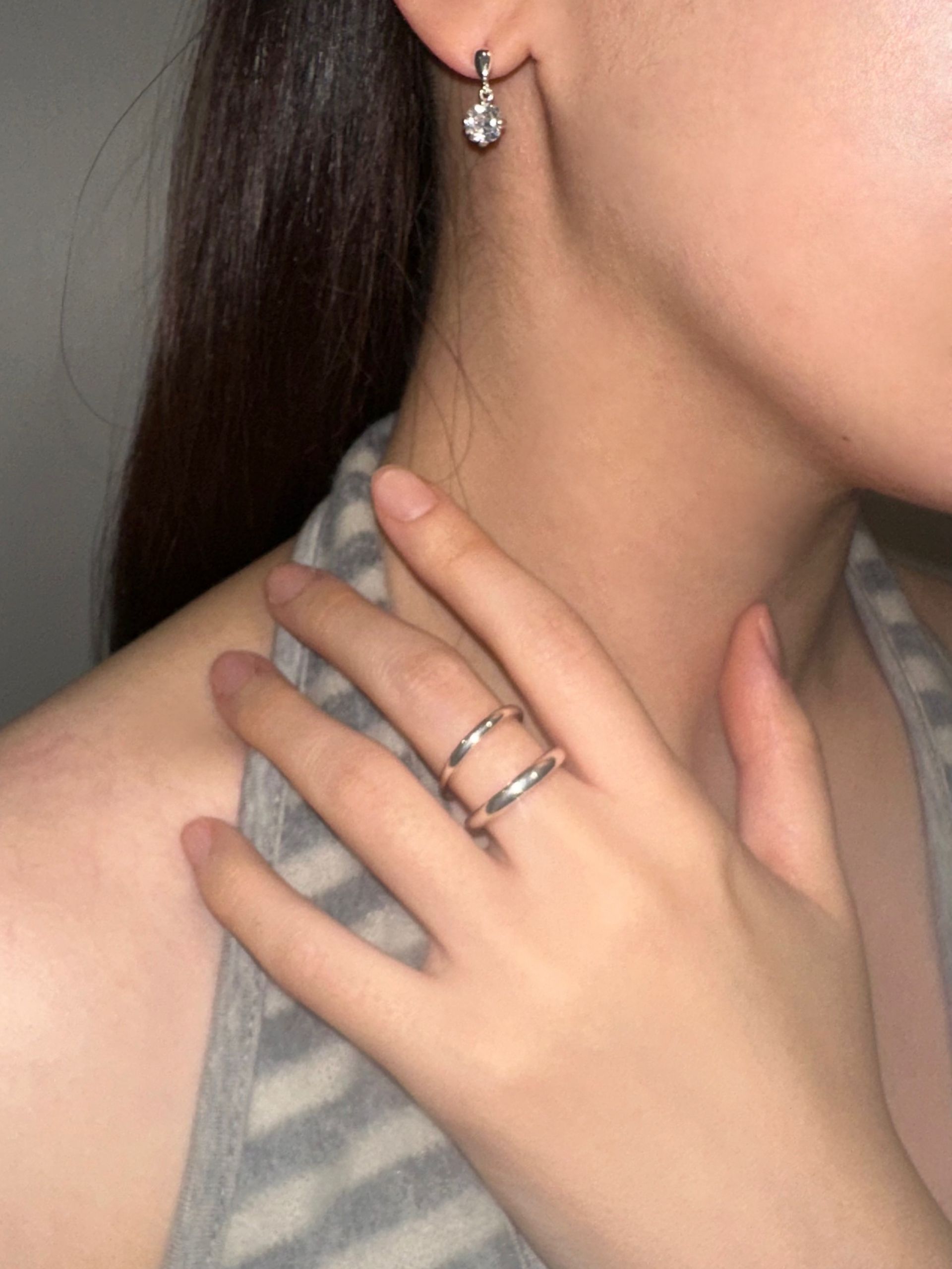 실버 컬러와 라운드 컷 스톤의 조합이 깔끔하고 세련된 무드를 더하며,