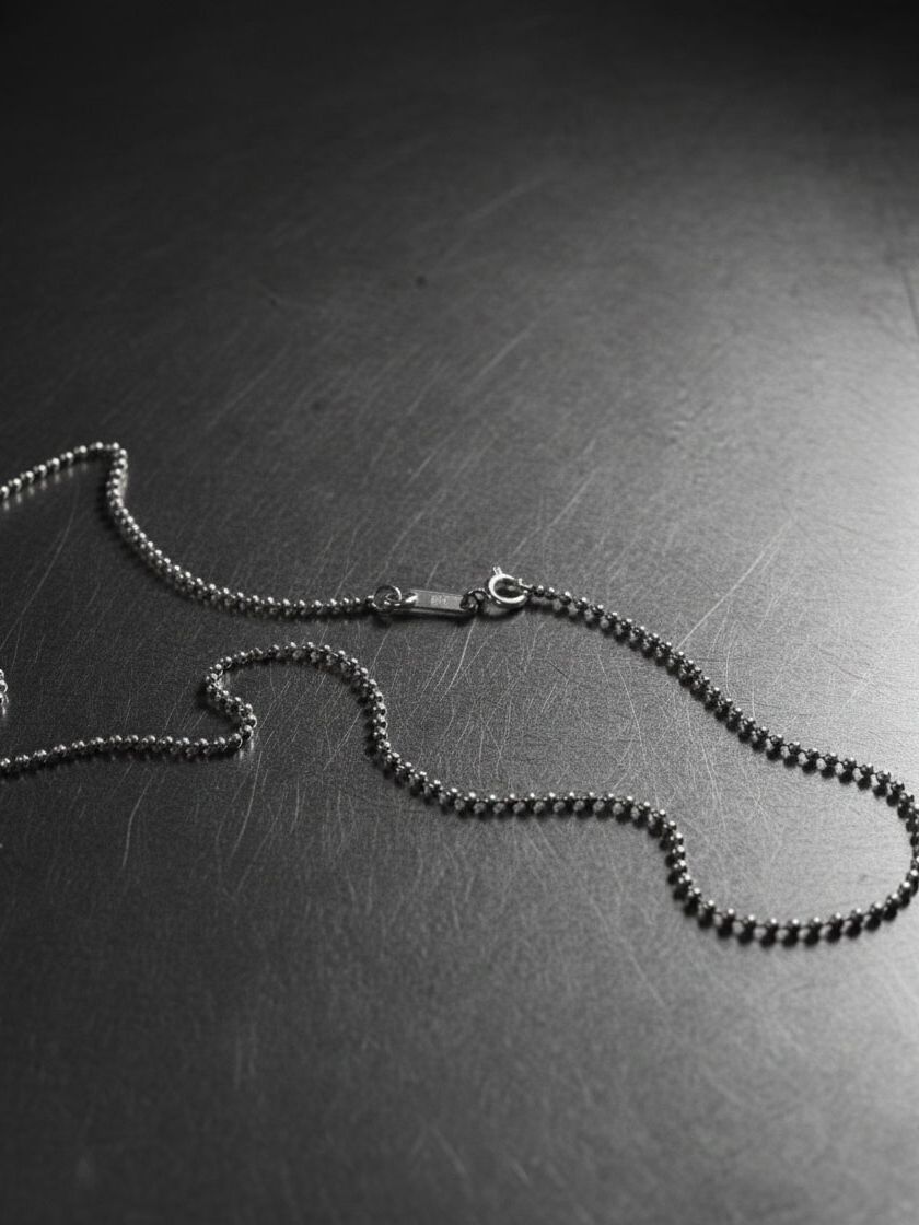 가늘고 유연한 볼 체인이 목선을 따라 자연스럽게 흐르며,