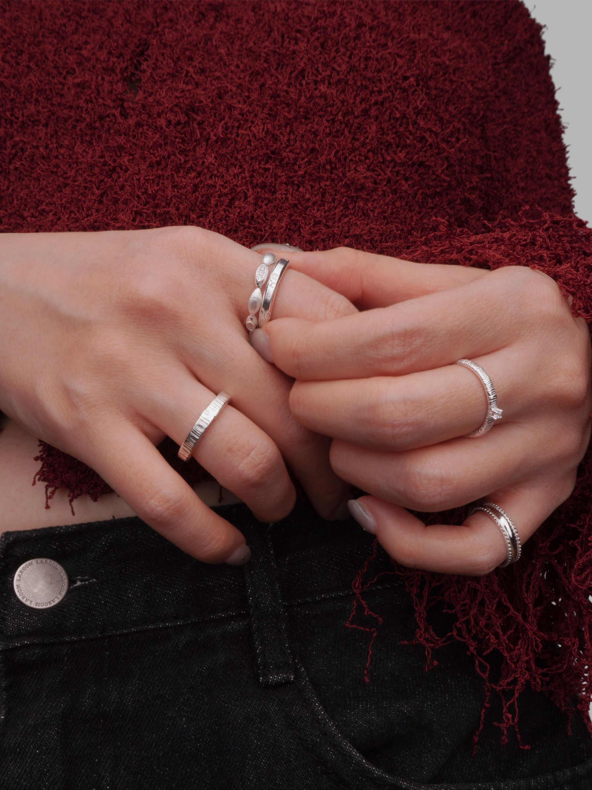 중앙에 놓인 미니멀 스톤은 과시적이지 않은 반짝임으로 균형을 이루며, 손끝에 절제된 포인트를 더합니다. 슬림한 두께감은 착용 시 손가락 라인을 한층 더 여리게 보이도록 연출해 주며, 단독으로는 고요한 분위기를, 레이어드 시에는 완성도 높은 스타일링을 완성합니다.
