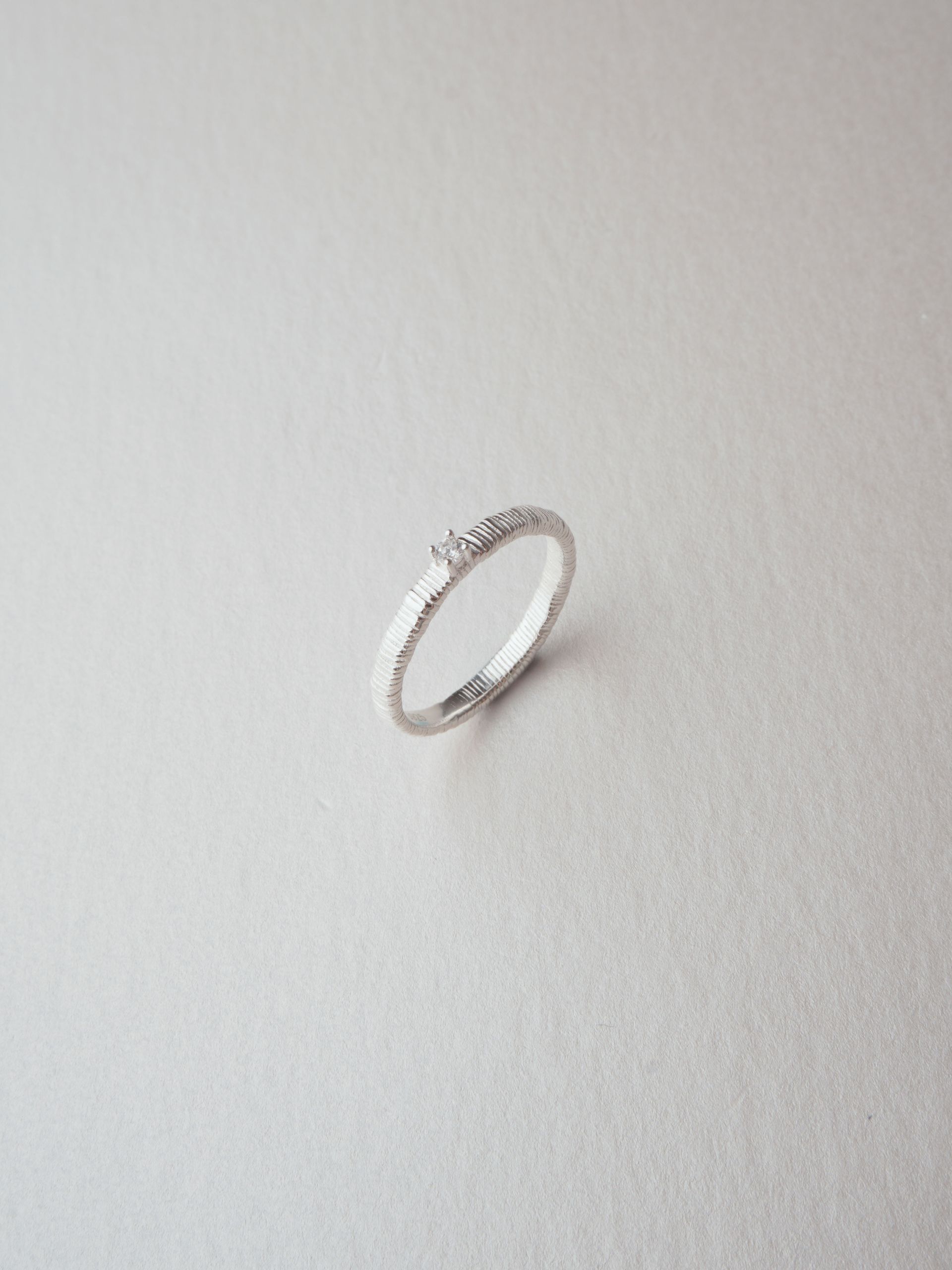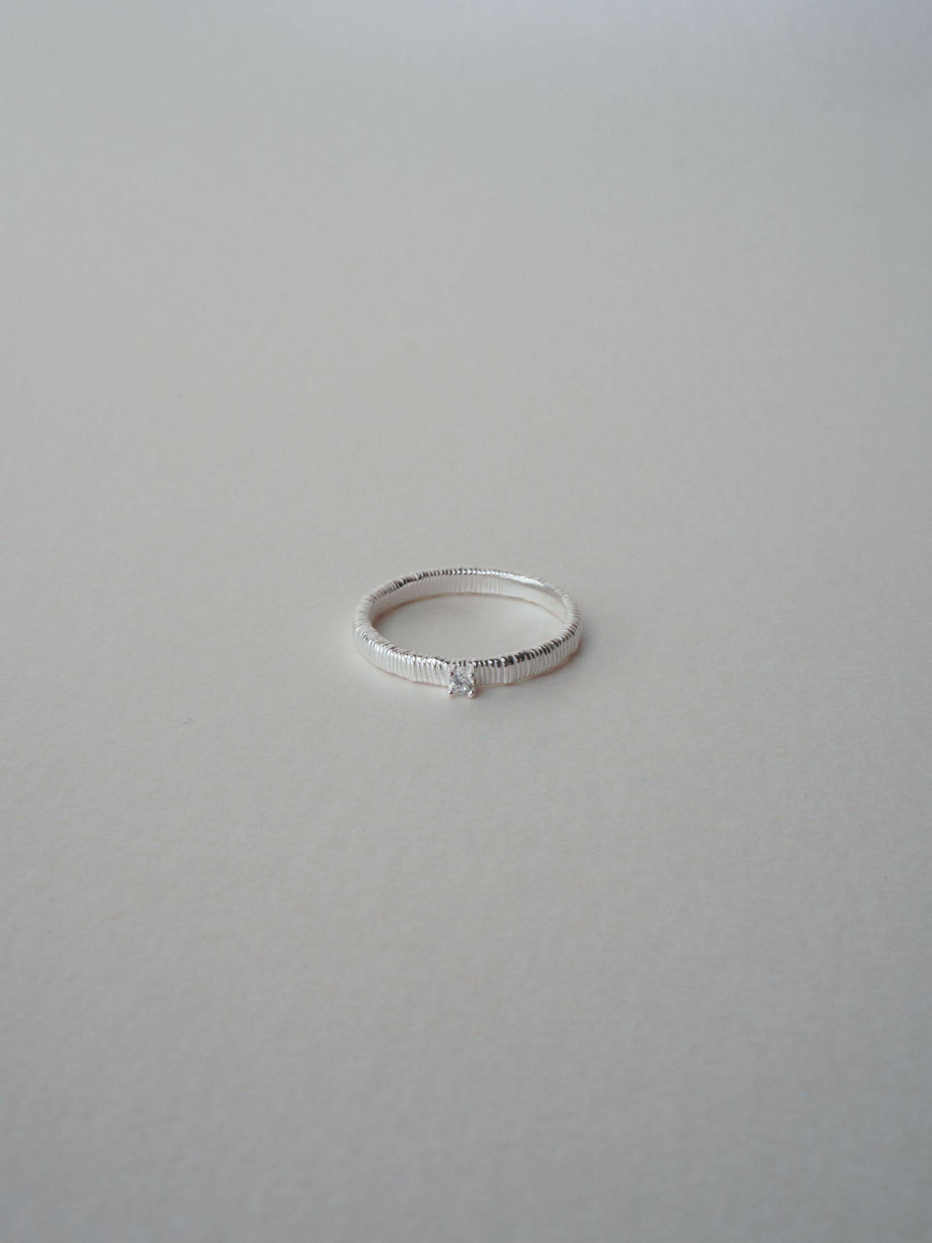 촘촘히 새겨진 스트라이프 텍스처 위로 세팅된 스톤이 조용한 존재감을 전하는 링입니다.